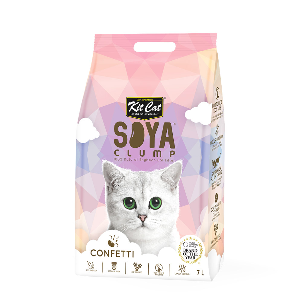 Kit Cat SOYA CLUMP عبارة عن فضلات القطط القابلة للتحلل بيولوجيًا بنسبة 100% وذات رائحة خفيفة. هذا المنتج الفريد مصنوع من الأجزاء غير القابلة للذوبان من فول الصويا والتي توجد في إنتاج حليب الصويا. عادةً ما يتم التخلص من هذه الأجزاء غير القابلة للذوبان بشكل أساسي في مكب النفايات، لكن Kit Cat ابتكرت غرضًا ثانيًا لاستخدام هذه المادة "المهدرة" كفضلات للقطط، واصفة إياها بأنها صديقة للبيئة.
